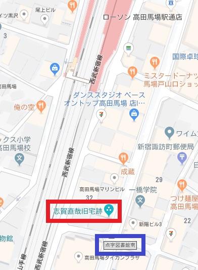 高田馬場駅の南側に志賀直哉の旧居跡の標識があります。点字図書館南の交差点の傍です。