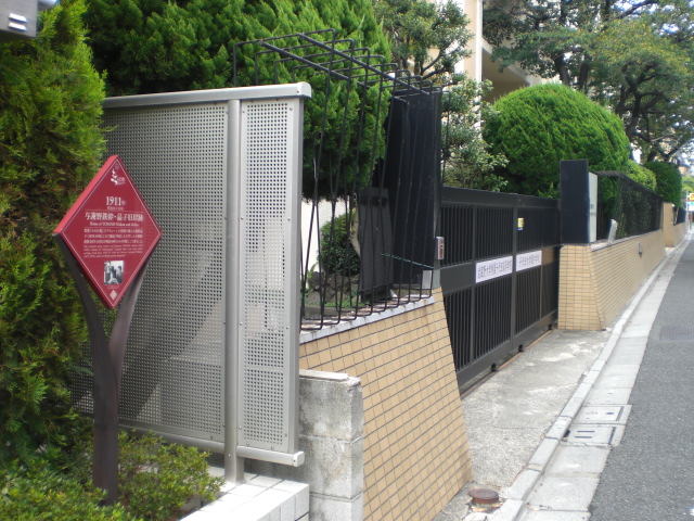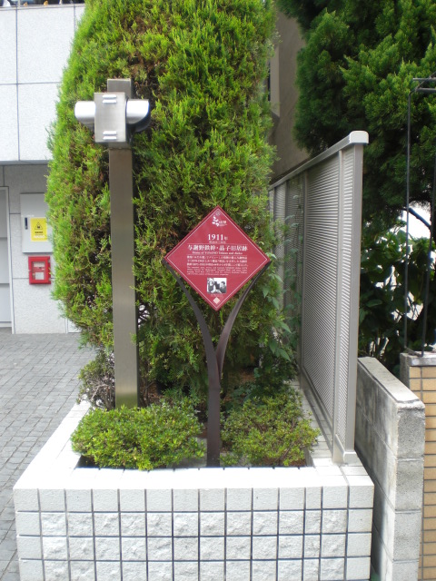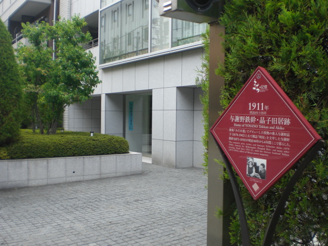 与謝野鉄幹 晶子旧居跡の標識が、武蔵野大学サテライト校の隣にあります。