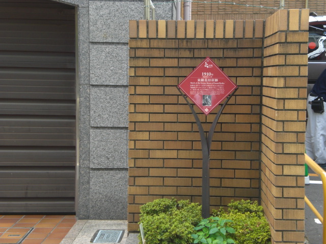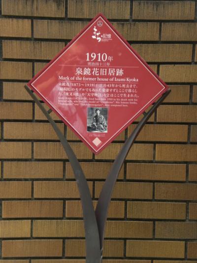 泉鏡花の旧居跡の標識が、文人通りから入った路地にあります。