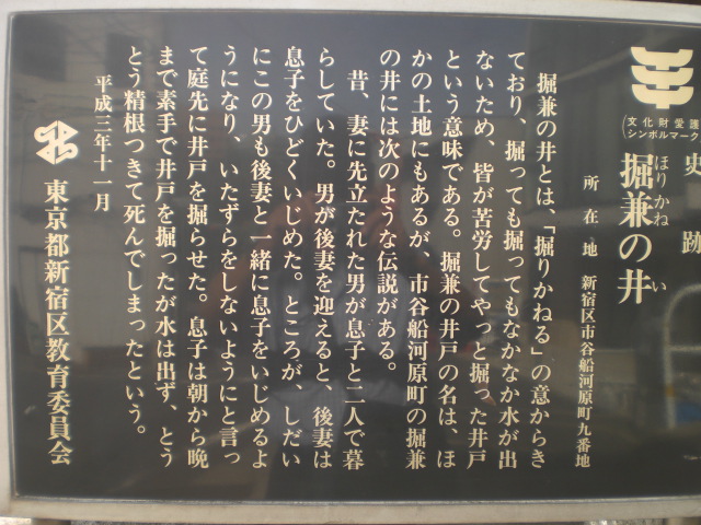 掘兼の井は、皆で苦労して掘った井戸のことで、解説板が市谷船河原町にあります。