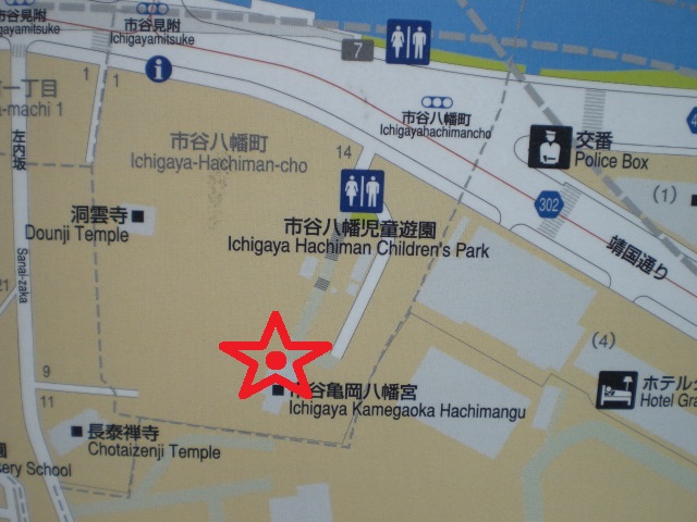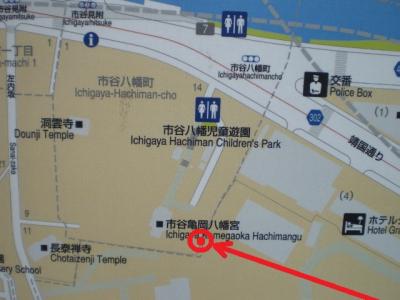 市谷の出世稲荷神社は、市谷亀ヶ岡八幡宮の階段を上がったすぐ右手にあります。