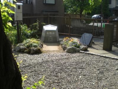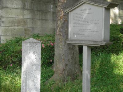 与謝野鉄幹晶子居住跡は、東京薬科大の北側の芝生の盛土土手の中間付近にあります。
