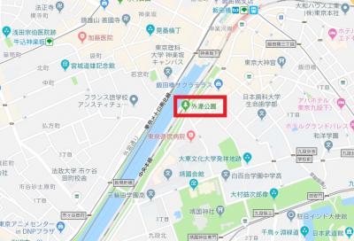 外濠公園は、JR飯田橋~市ヶ谷駅の間、外濠の東側にある細長い公園です。