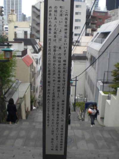 一般的には、女坂は、男坂よりも、勾配が緩いのですが、明神女坂の場合は、勾配は。同じくらいかもしれません。