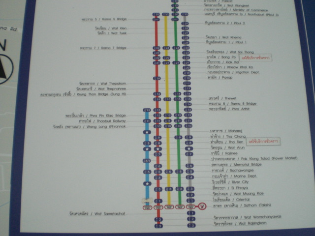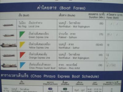 エクスプレスボートには、普通(旗なし)、特急(黄色の旗)、ノンタブリー以遠の特急(緑色の旗)、チャオプラヤーツーリストボート(青色の旗)等があります。