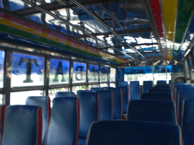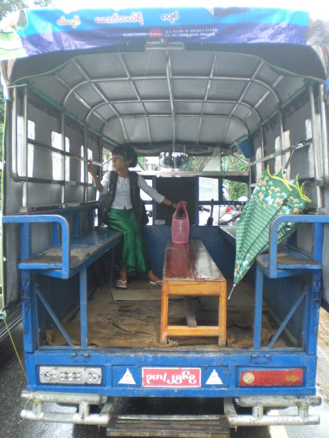 タイのトゥクトゥクの座席が、進行方向に対して直角になってのに反して、ダーウェーのツゥクトゥクは、進行方向に対して並行しています。