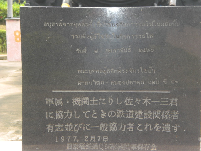 展示された機関車の前には、旧泰緬鉄道関係者による石碑が立てられています。