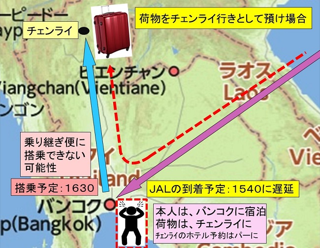 問題は、荷物を最終目的地のチェンライで受け取りとし、預託すると、バンコクからの便に乗り遅れると、荷物と本人が別々になってしまう可能性があります。