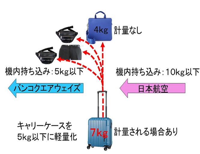 また、機内持ち込みにすると、バンコクエアウェイズの機内持ち込み制限が5kg以下であり、超過料金を支払うこととなります。