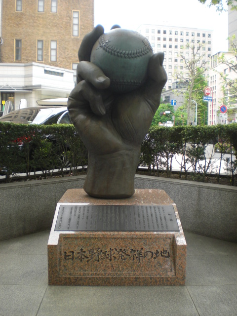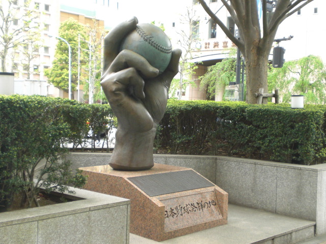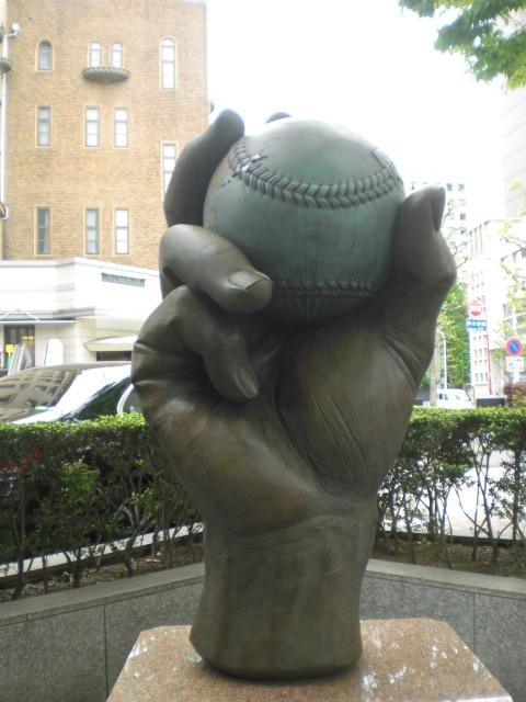 右手で、野球のボールを握っている像と記念碑が置かれています。
