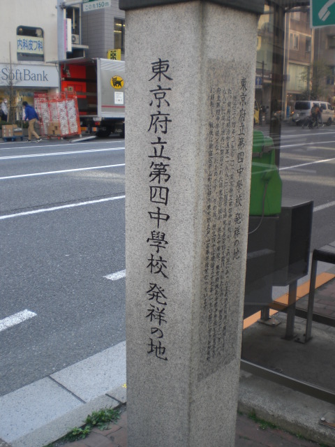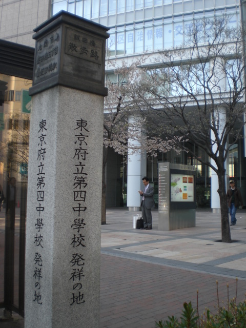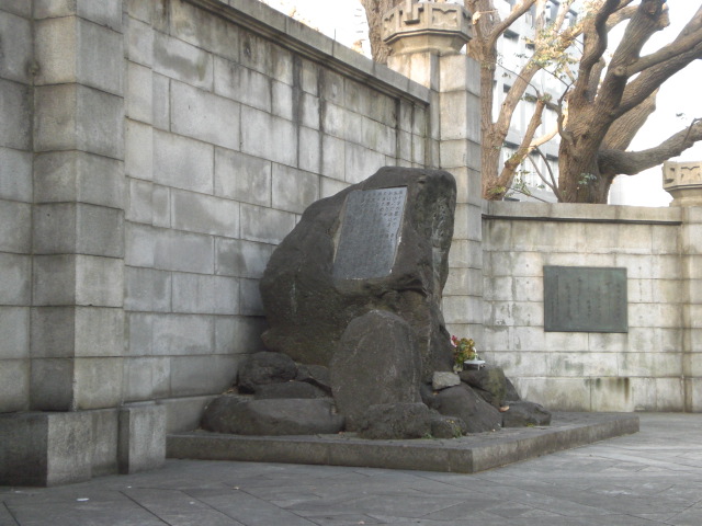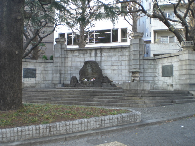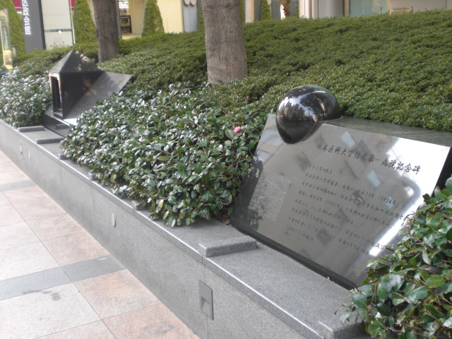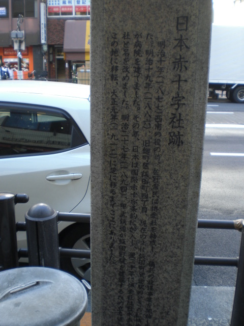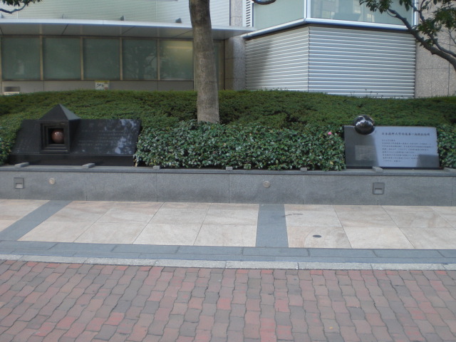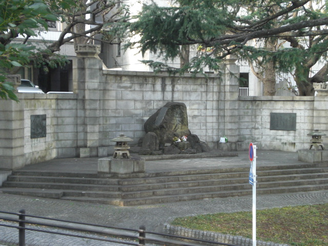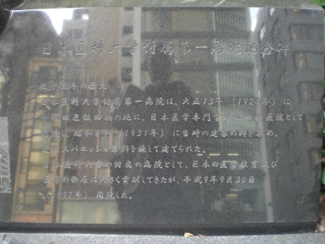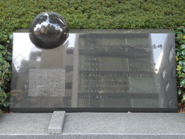 東京区政会館の前に、日本医科大学付属第一病院記念碑があります。