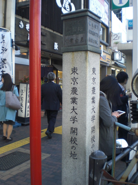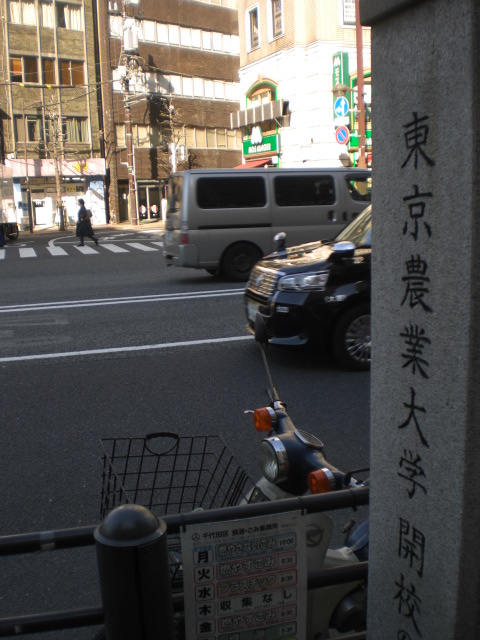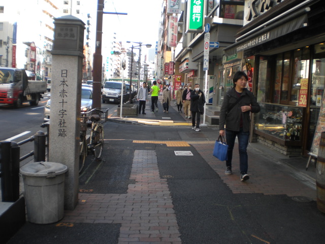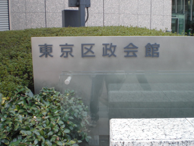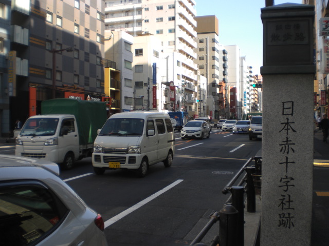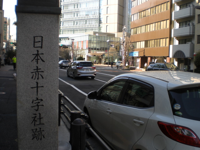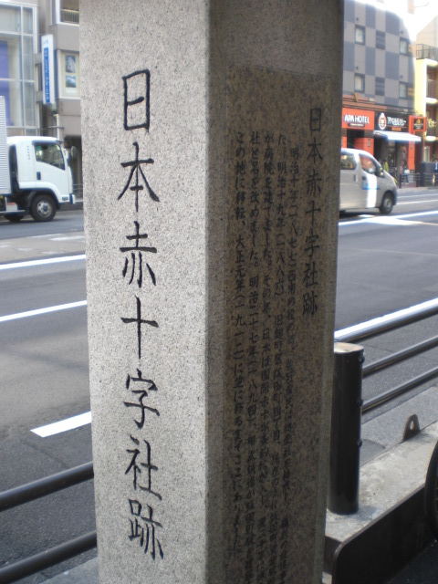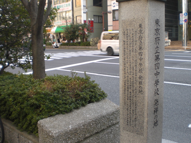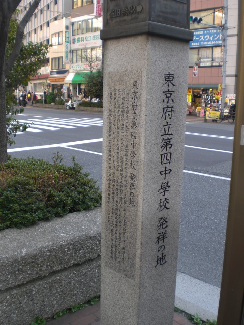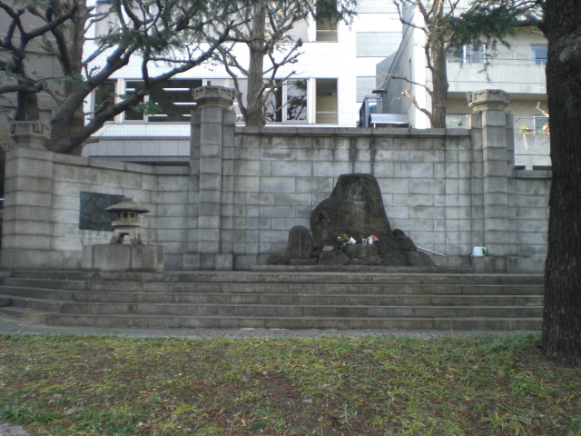 東京区政会館の前に、日本医科大学付属第一病院記念碑があります。