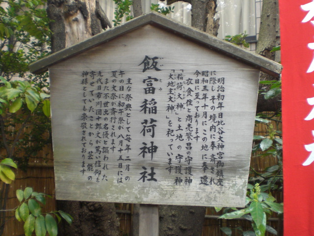 飯富稲荷神社の歴史は、古いようで、解説板によると飯富稲荷神社の歴史は、明治初年に日比谷大神宮の一角に創設されたことから始まるようです。