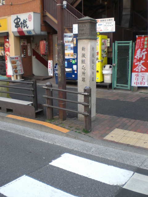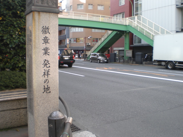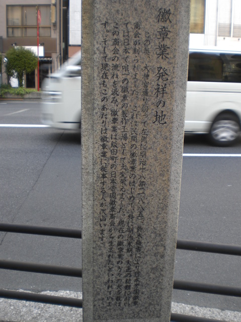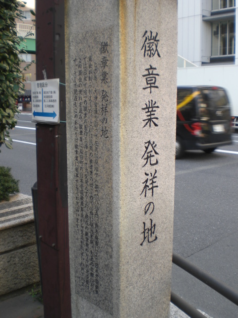 目白通りから東京大神宮の参道が別れる三叉路に、徽章業発祥の地の石碑が立てられています。