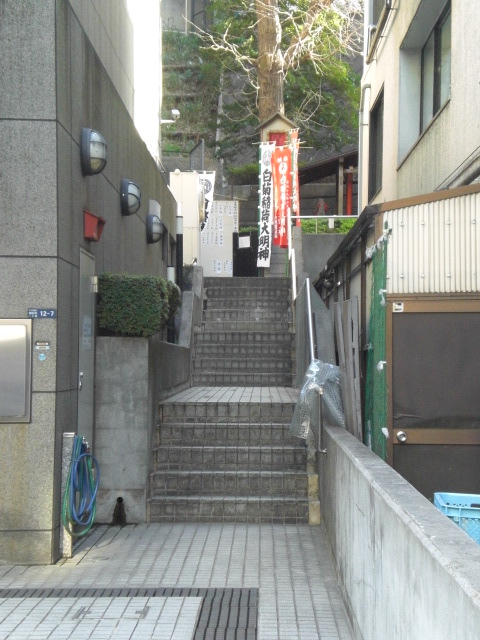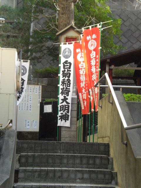 白菊稲荷神社は、東京大神宮の参道から西側に入り、高台の傾斜地に立てられています。
