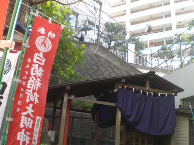 白菊稲荷神社の南側は、傾斜地からの保護のためのコンクリート壁で守られていまが、全体として、狭い平担部に、ご神殿が置かれています。
