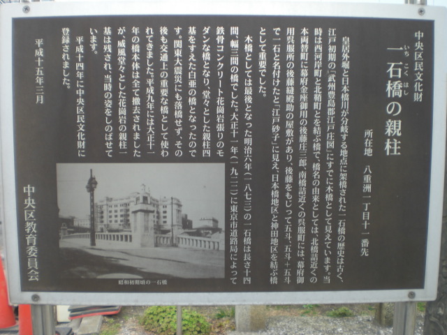 平成9年に現在の一石橋に架けかえる際、大正11年に架けられた一石橋の堂々とした姿を、残すため、当時の親柱を1基残し、現在の一石橋の袂に設置しました。