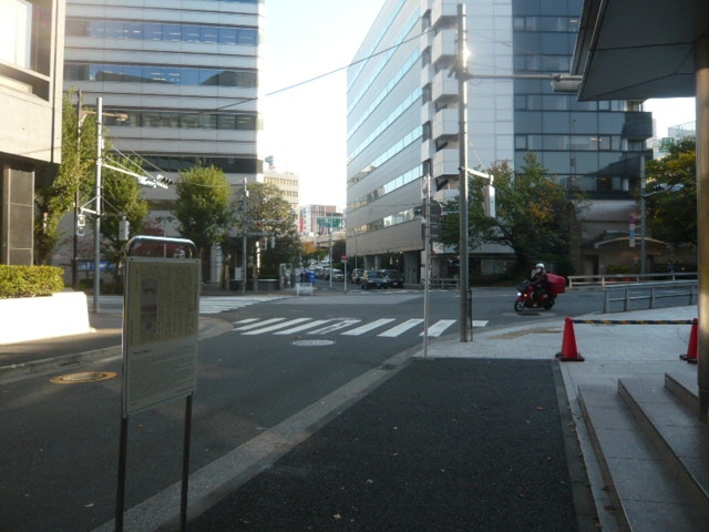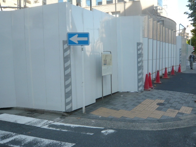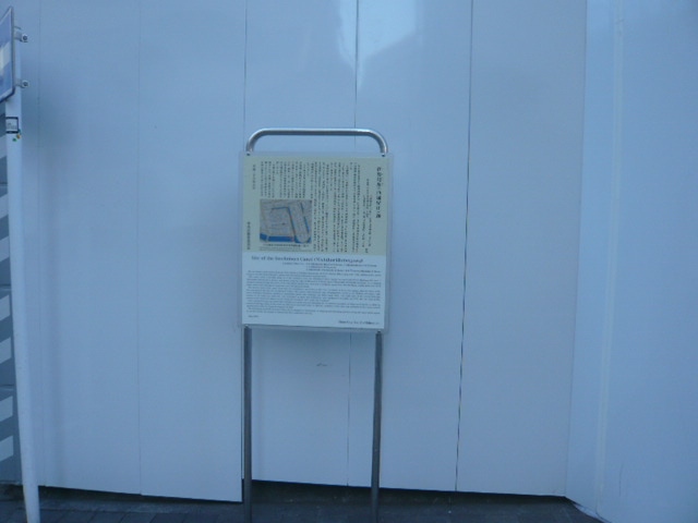 伊勢町堀跡は、解説板のみ残っています。堀の跡地は、再開発の工事中で、塀で囲われています。