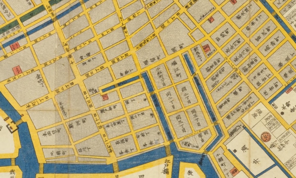 周辺には、小網町、堀留町、茅場町、按針町、鎧の渡し等、現在も残っている地名が記載されています。