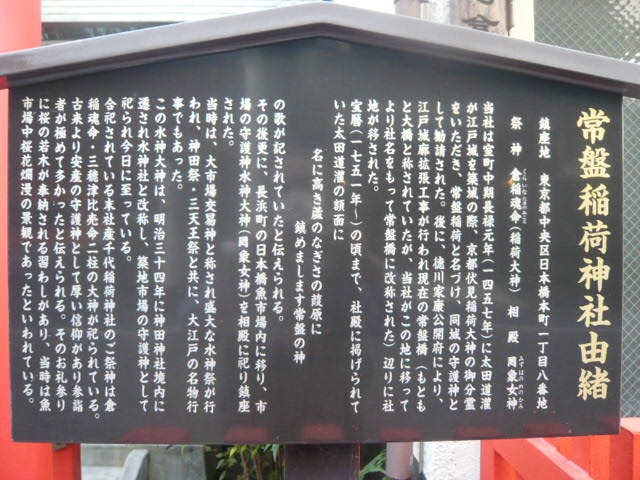 常盤稲荷神社は、日本橋川の北側に置かれている稲荷神社です。水産業の神様として崇められています。
