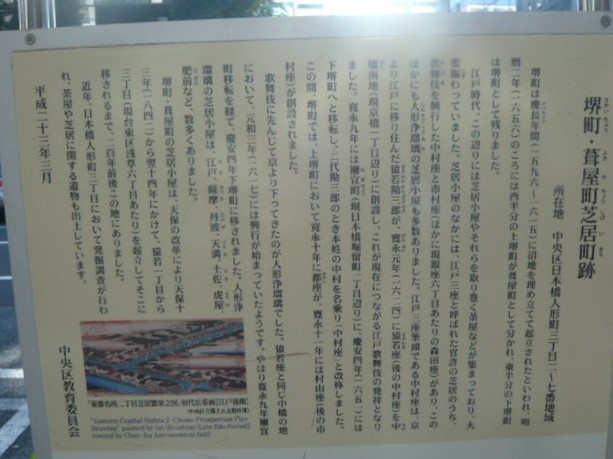 人形町通りに、堺町・葺屋町芝居町跡の解説板がありました。江戸時代の芝居小屋の街並みの跡です。