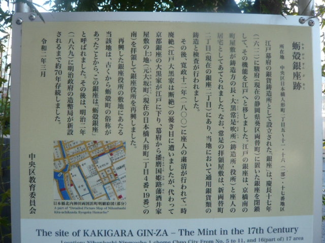 日本橋の蛎殻町に、蛎殻銀座跡の解説板があります。江戸時代、銀貨幣を造っていた銀座がありました。
