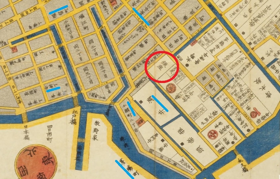国会図書館の江戸切り絵を見てみますと、伊勢町と堀留町の地名が載ってます。
