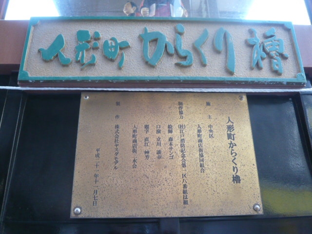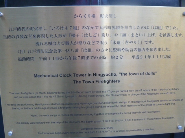 からくり櫓の解説板の説明によると、日本橋の人形町を担当していたのは、「いろは47組」のなかで、「は組」だったそうです。
