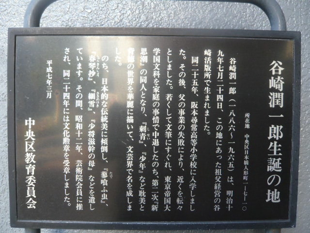 谷崎潤一郎生誕の地の標識が、人形町通りの西側にあります。料亭のような造りの建物の壁にあります。
