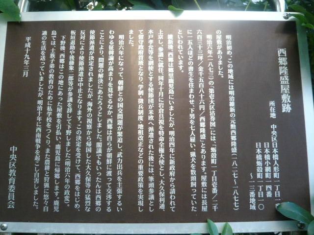 西郷隆盛が唱えていた征韓論が、認められず、鹿児島に帰った後、屋敷跡は、十思小学校、東華小学校と変遷し、現在は、日本橋小学校となっています。
