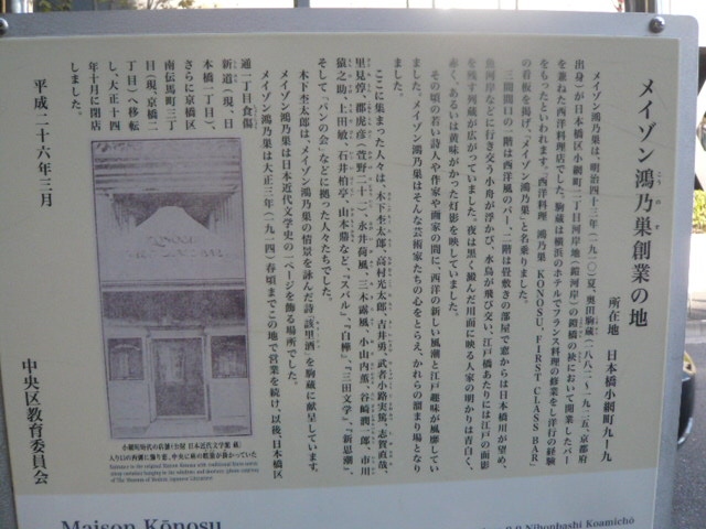 メイゾン鴻乃巣は、明治の末期、ここ日本橋の鎧橋の袂の地で創業し、西洋料理専門店として、またFIRST CLASS BARとして一世を風靡したそうです。その後、日本橋に移転し、最後は、小伝馬町で閉店するまで、営業を続けました。