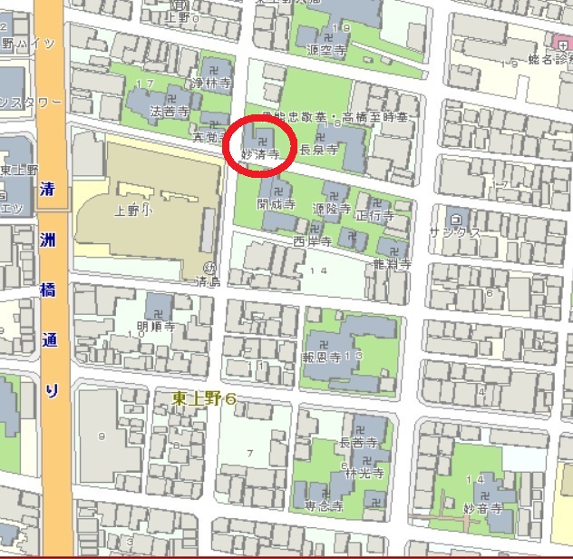 明暦の大火により被災し、浅草本願寺境内へ移転、宝暦10年(1760)に妙清寺と改称、文化3年(1863)浅草本願寺境内を離れ、現在の地に移転したとのことです。