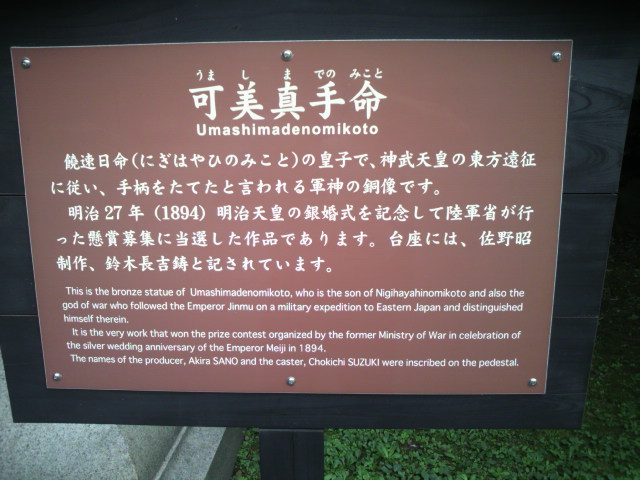 時あたかも日清戦争の時期であり、陸軍省が、武功を立て、目的達成のために尽力した軍神ともいえる可美真手命の銅像を建てることとし、その提案を全国に諮った際に、献納された銅像です。