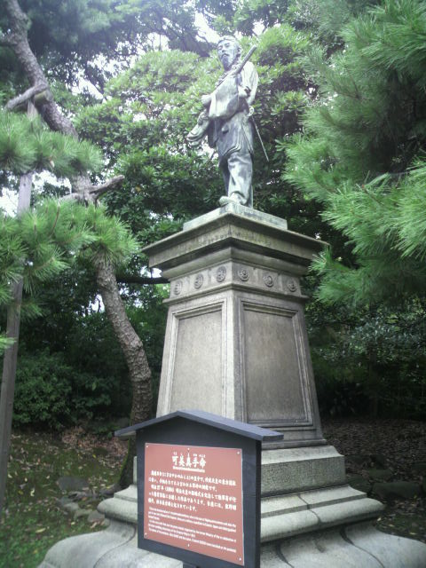 浜離宮恩賜庭園の可美真手命銅像は、芳梅亭の南側に建てられています。