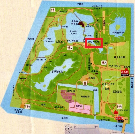 浜離宮恩賜庭園の潮入りの池のほとりに、燕の御茶屋があります。