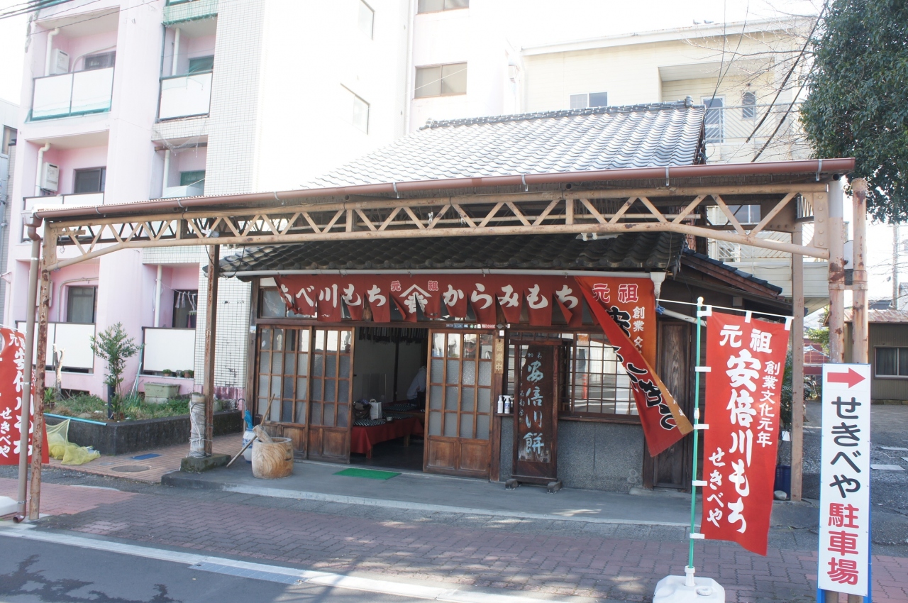 安倍川そばにある安倍川餅の老舗。店内のイートインスペースは赤い絨毯に座布団、レトロな風情漂うお店です。古い報道写真なんかも展示があって、時間があればじっくり見るのも良いです。