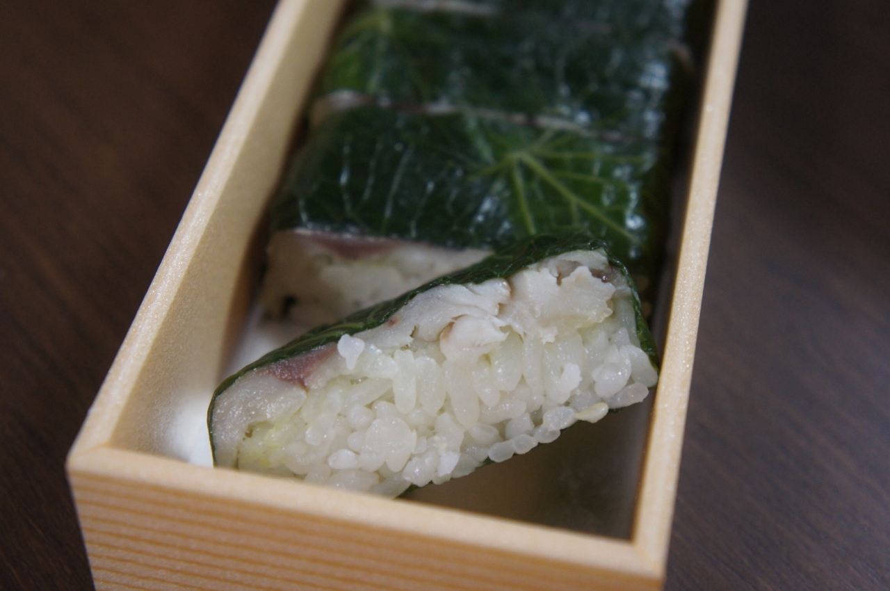 テイクアウトで「活きあじわさび葉寿司」お持ち帰りしました。見た目よりご飯が少なく、あじの存在感があります。わさび葉はピリッとはせず、風味だけ。