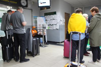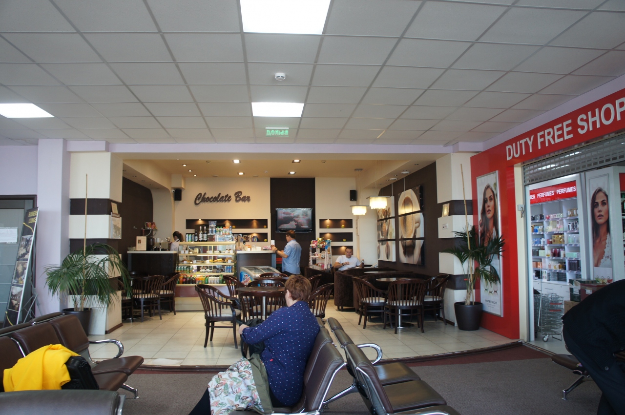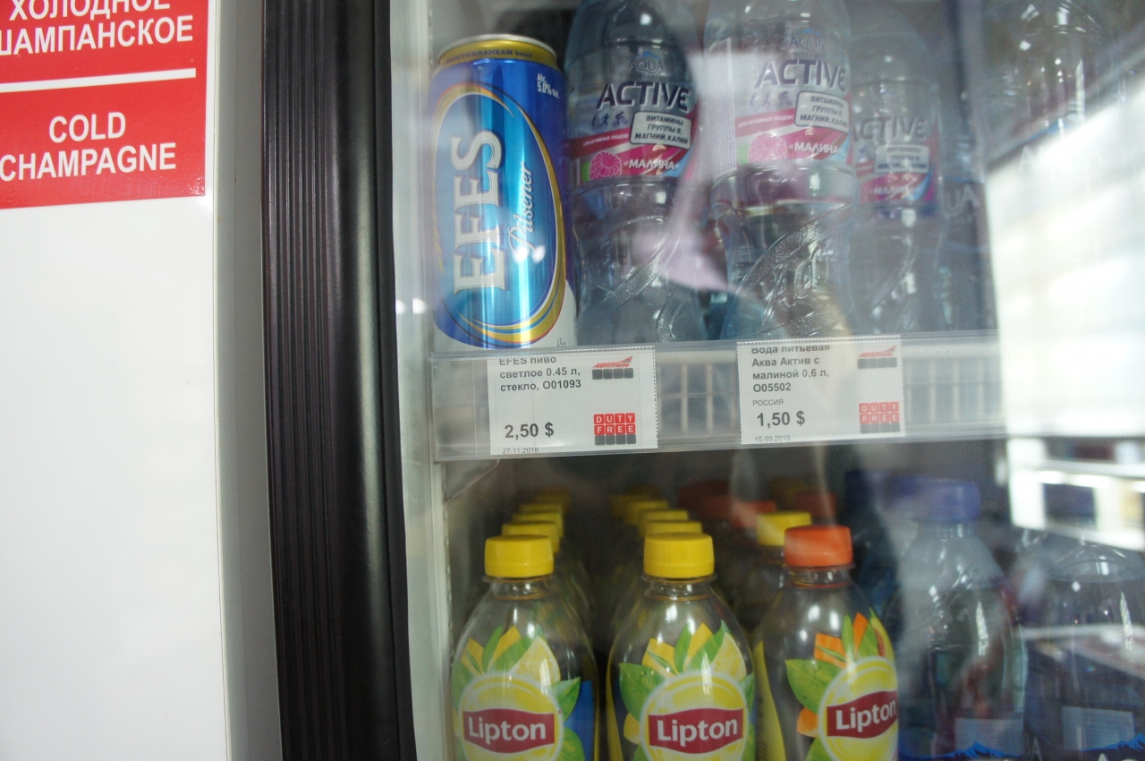 出国後は、小さなチョコレートバー(喫茶 兼 売店)と免税店があります。チョコレートバーでは市販のアイスクリームも100P程度で売ってました。バーのビールは500P(市価の10倍)ですが、免税店に冷えたビールが2.5ドルで売ってました。ルーブル払いだと135P(市価の2倍)でした。- 旅行時期