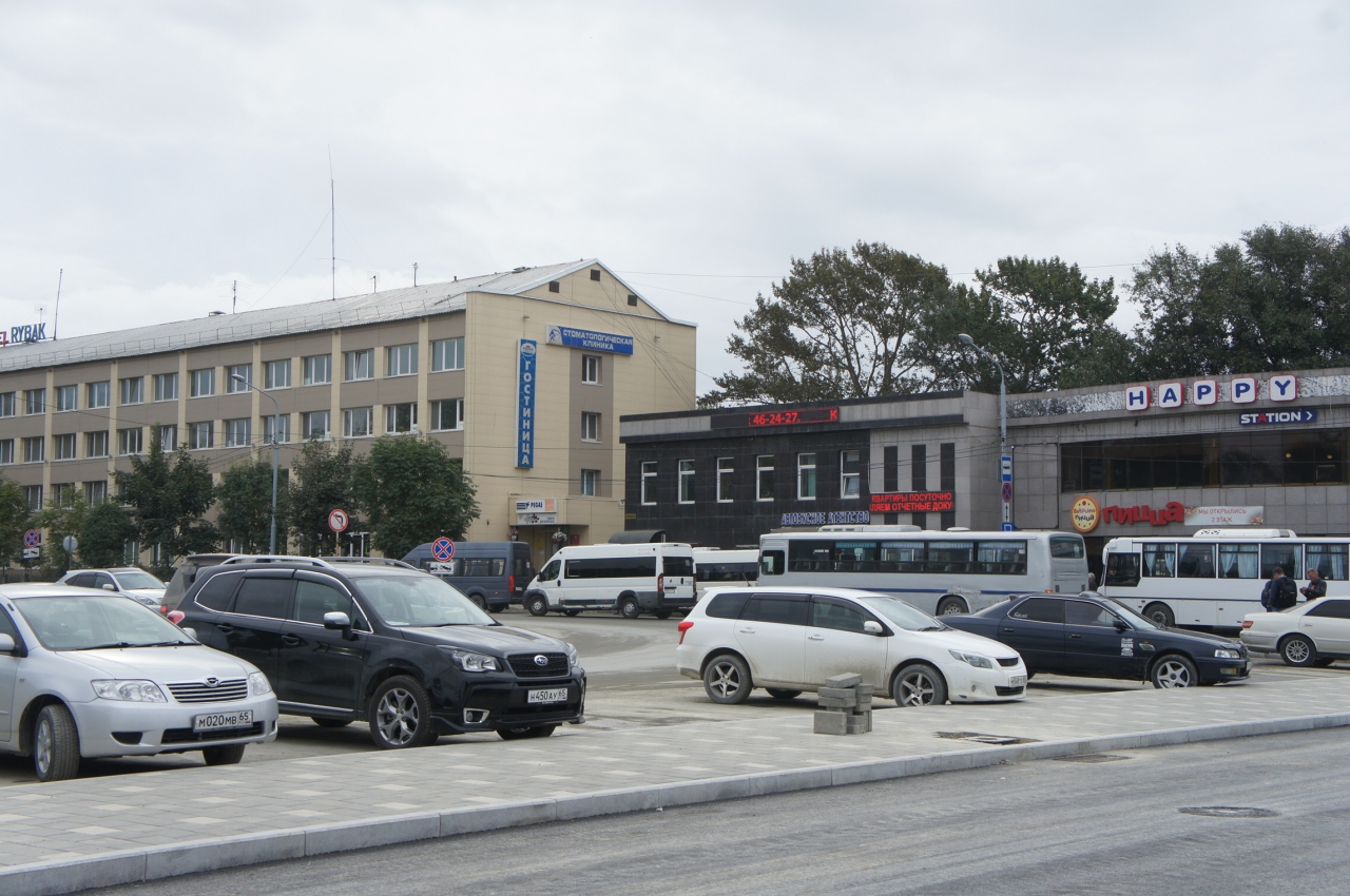 コルサコフ行きバス乗り場、ユジノサハリンスク駅に背を向けて右側の建物