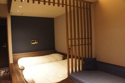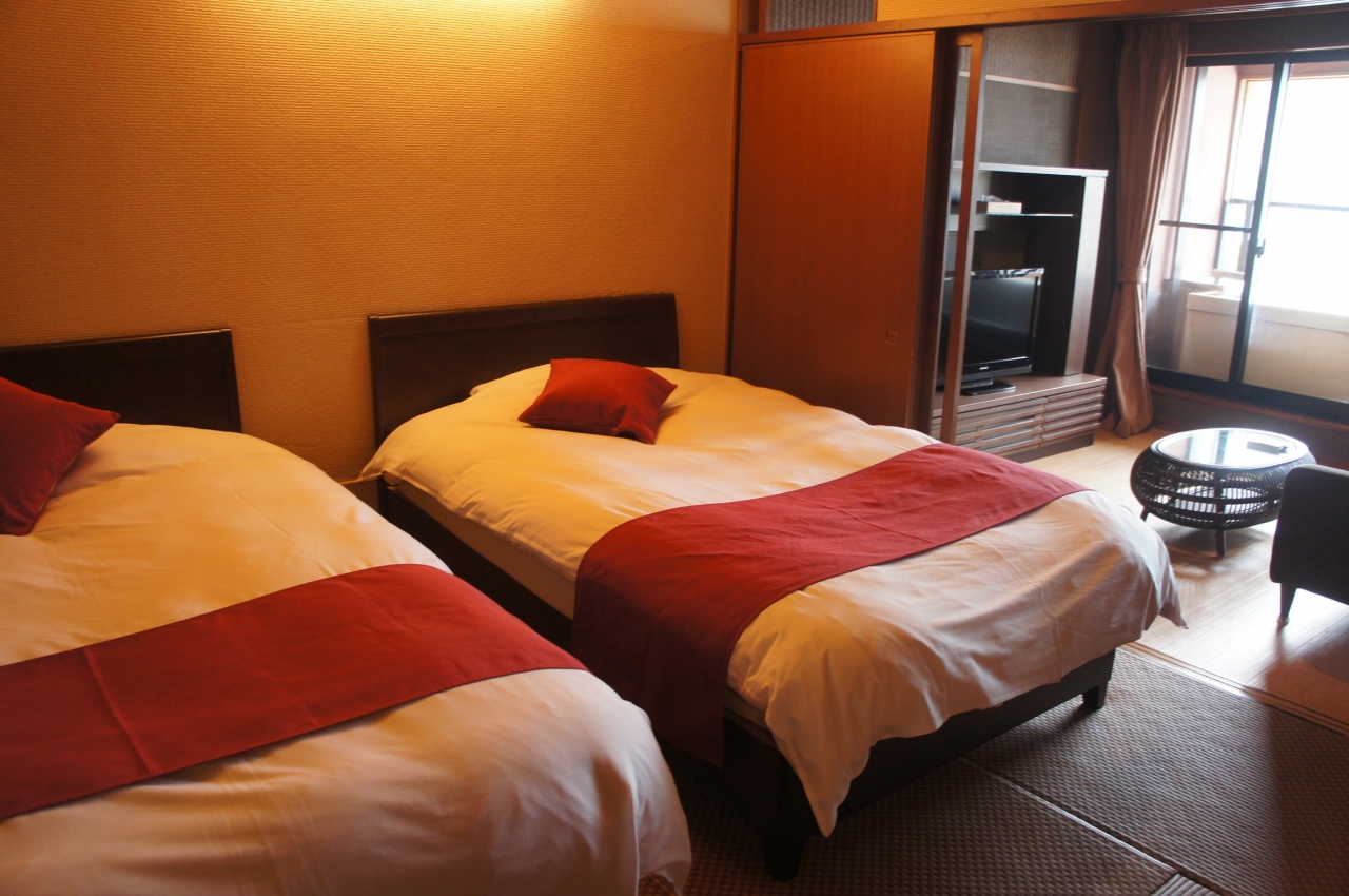 お宿自体は古いらしいけど、露天温泉付き客室はベッドで広々した感じで、ゆったり過ごせました