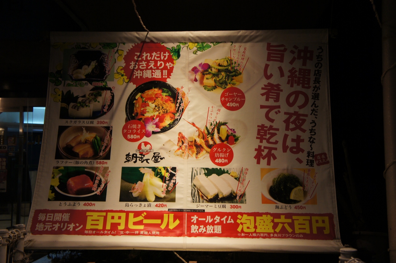 以前は沖縄料理があったようですが、現在はほとんどありません。入り口階段にじーまみ豆腐やグルクン唐揚げ、らふてーや豆腐ようなど値段付きメニューが貼ってありますが、実際にはすべてなくなり、沖縄料理はちゃんぷるーだけです。あとは普通の居酒屋メニュー、、、