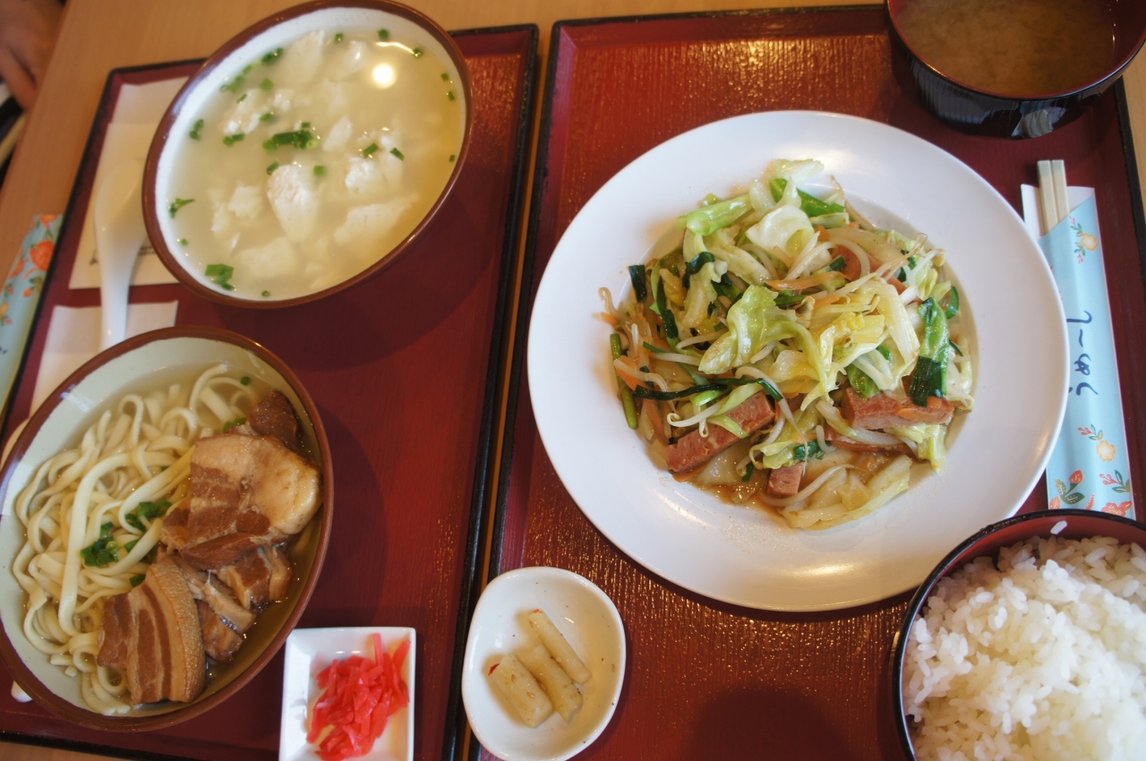 二人でたまなー(キャベツ)ちゃんぷるー定食650円、三枚肉そば650円、ゆし豆腐300円