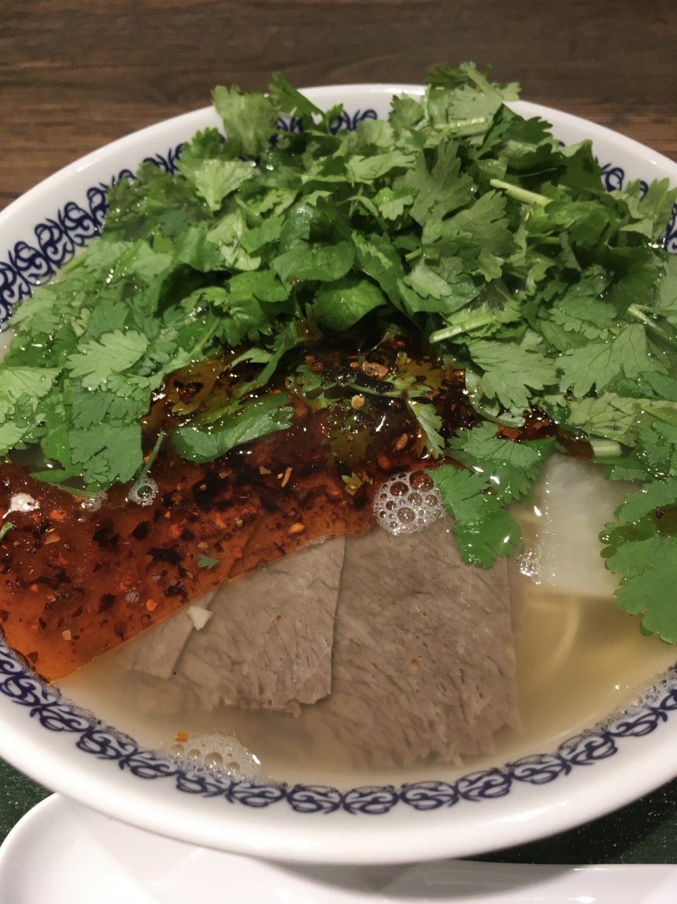 提供された牛肉麺(パクチー大盛り)は中国臭満載。一気に八重洲から中国の食堂にいる気分です。