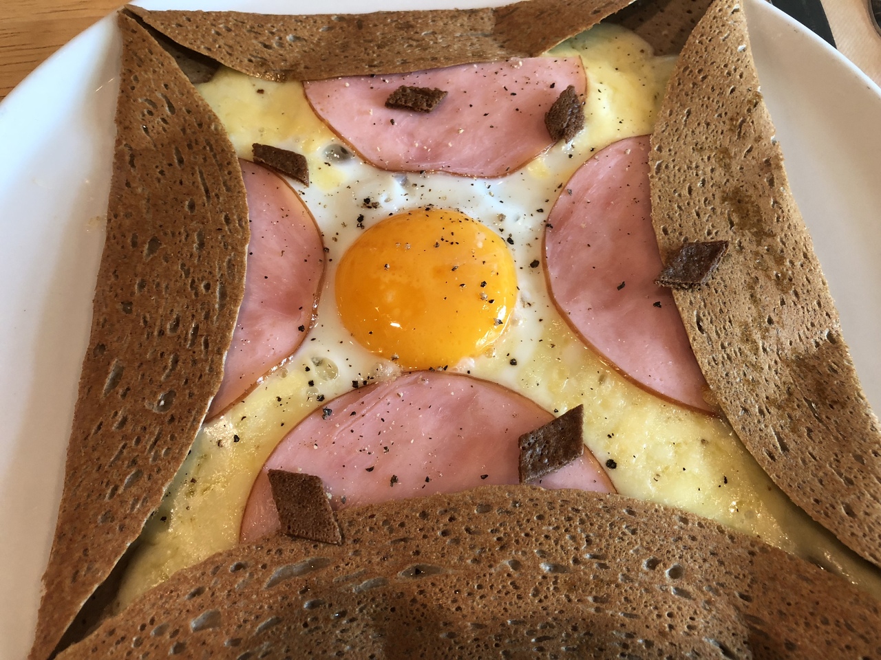 ランチはチーズ、ハム、玉子の載ったコンプレットガレットと、夜メニューから日替わりで1つの計2種類が頂けます。