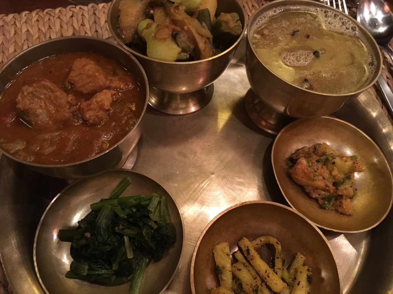 内容はチキンカレー、ダルカレー、野菜カレー、青菜の炒め物、ネパール風漬物、ライスで、