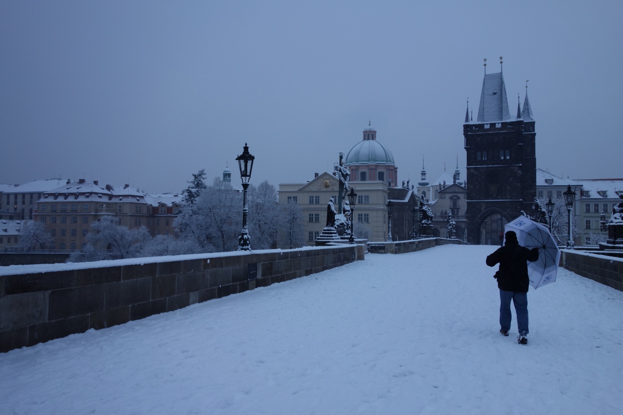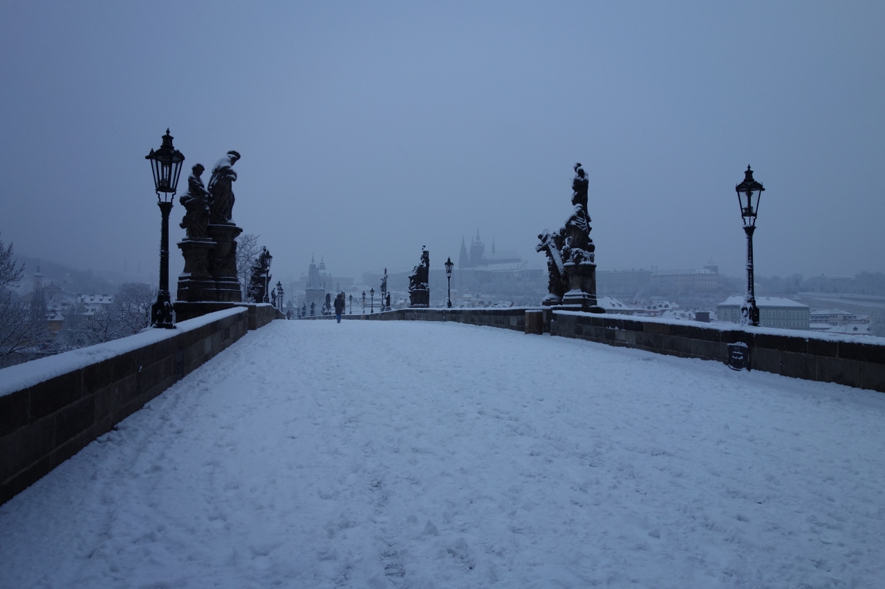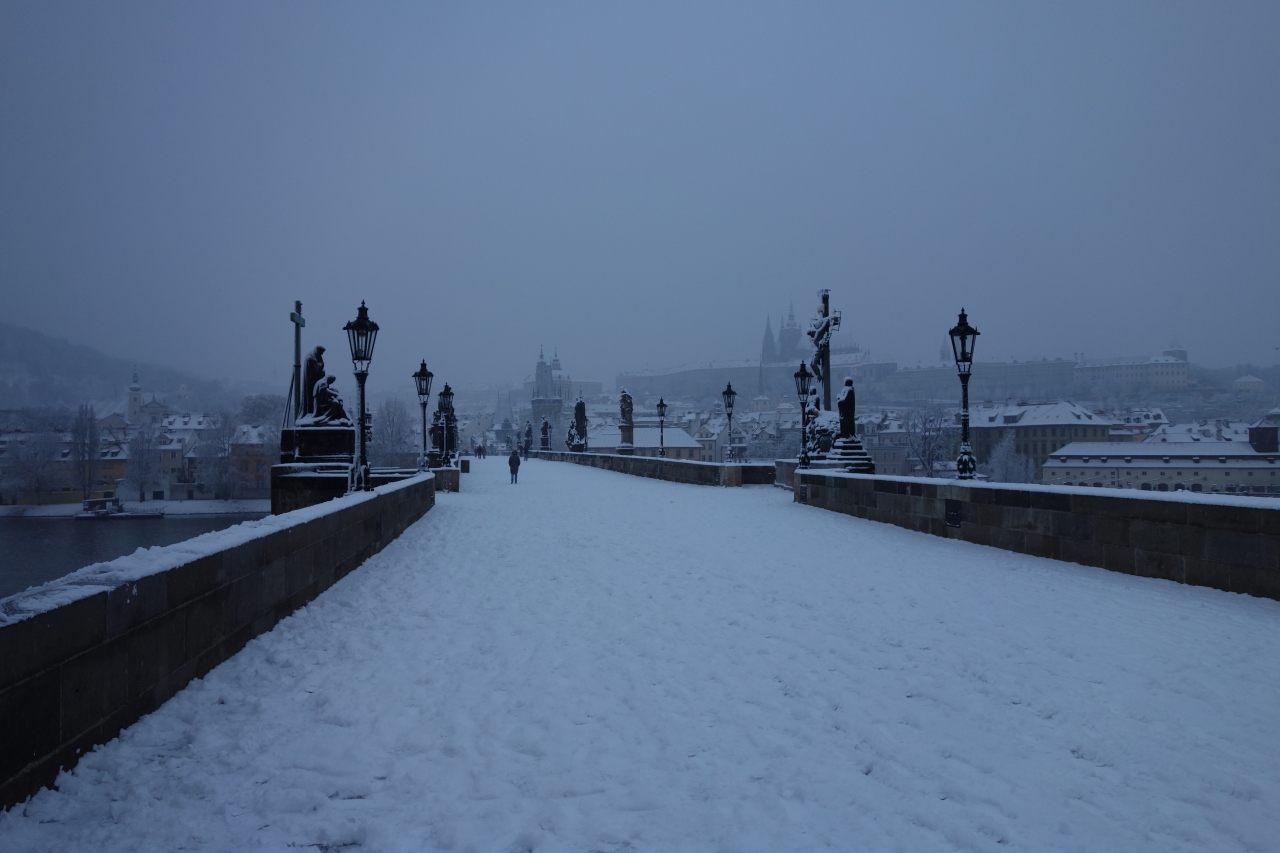 2月、雪の降る中、早朝のカレル橋に行きました。