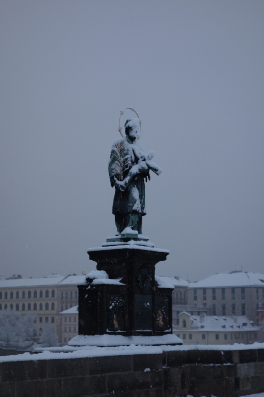 静まり返ったカレル橋、静かに降る雪、雪を被った聖人、そしてプラハ城。