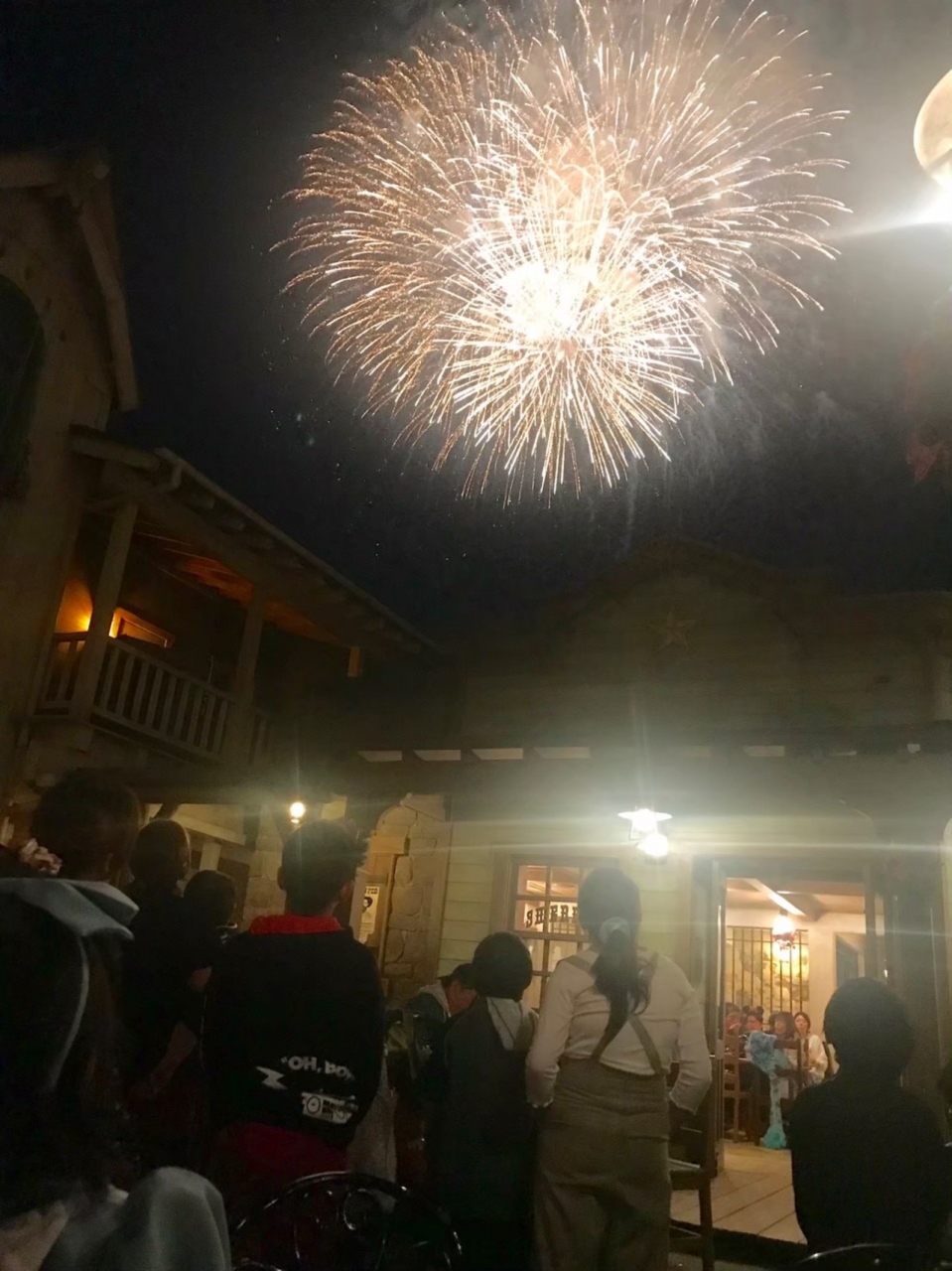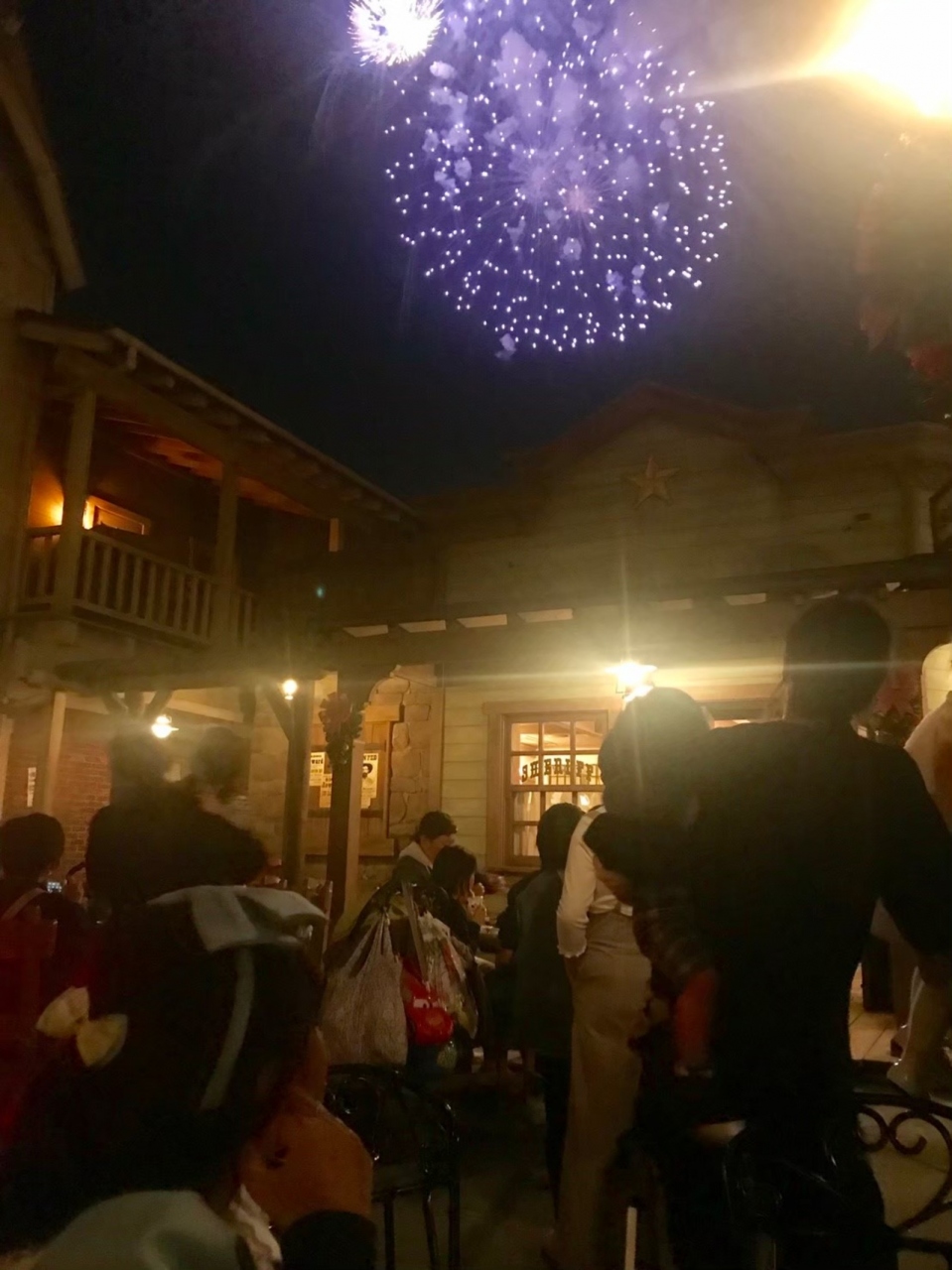 ディズニーランドでもディズニーシーでもだいたいどこからでも見ることが出来ます。ハングリーベアレストランのテラス席から見ました。花火が頭上で近くて大迫力でした。- 旅行時期