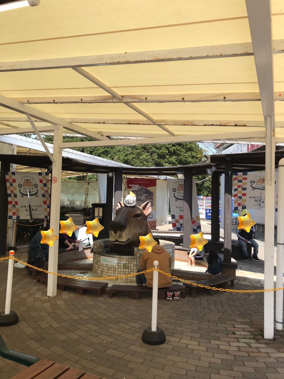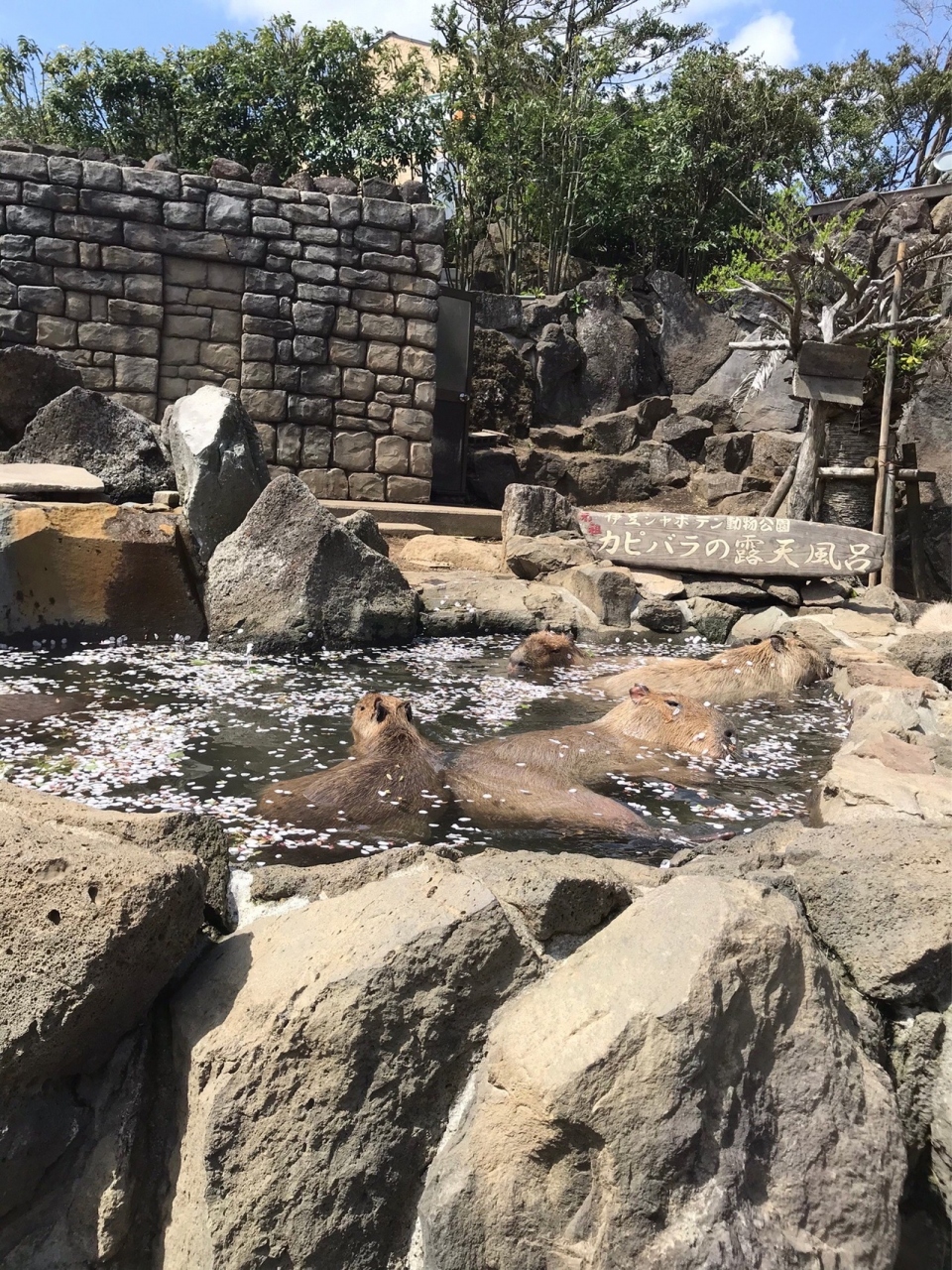 無料のカピバラの像がある足湯があり癒されます。拭くためのペーパーと消毒も準備されていました。- 旅行時期