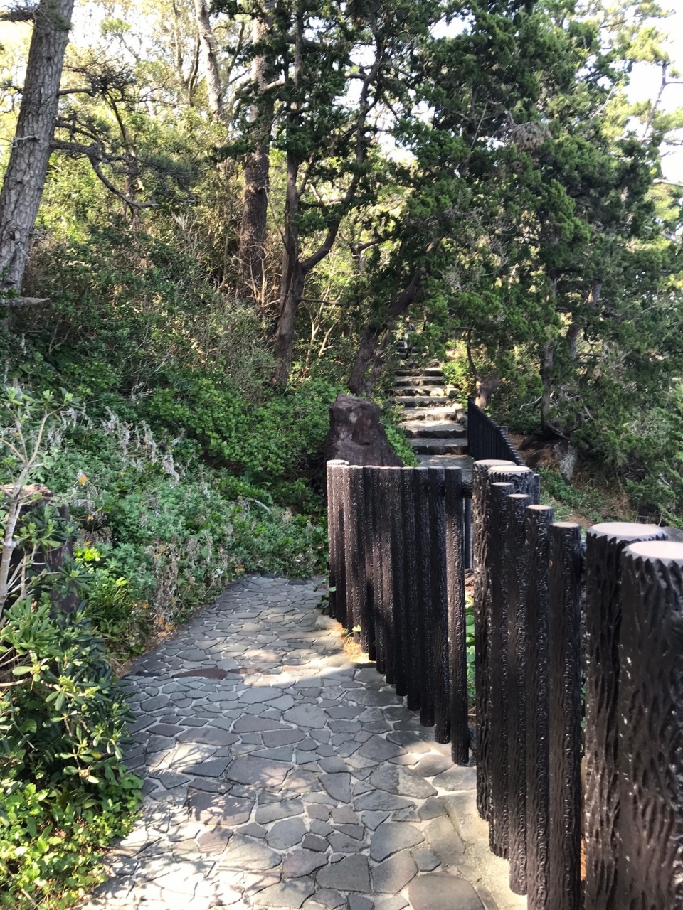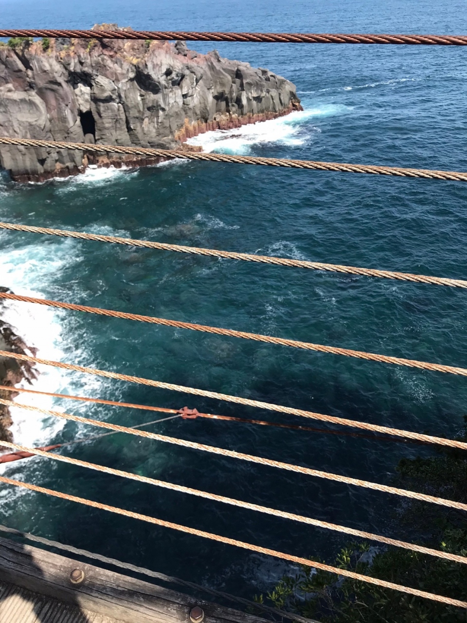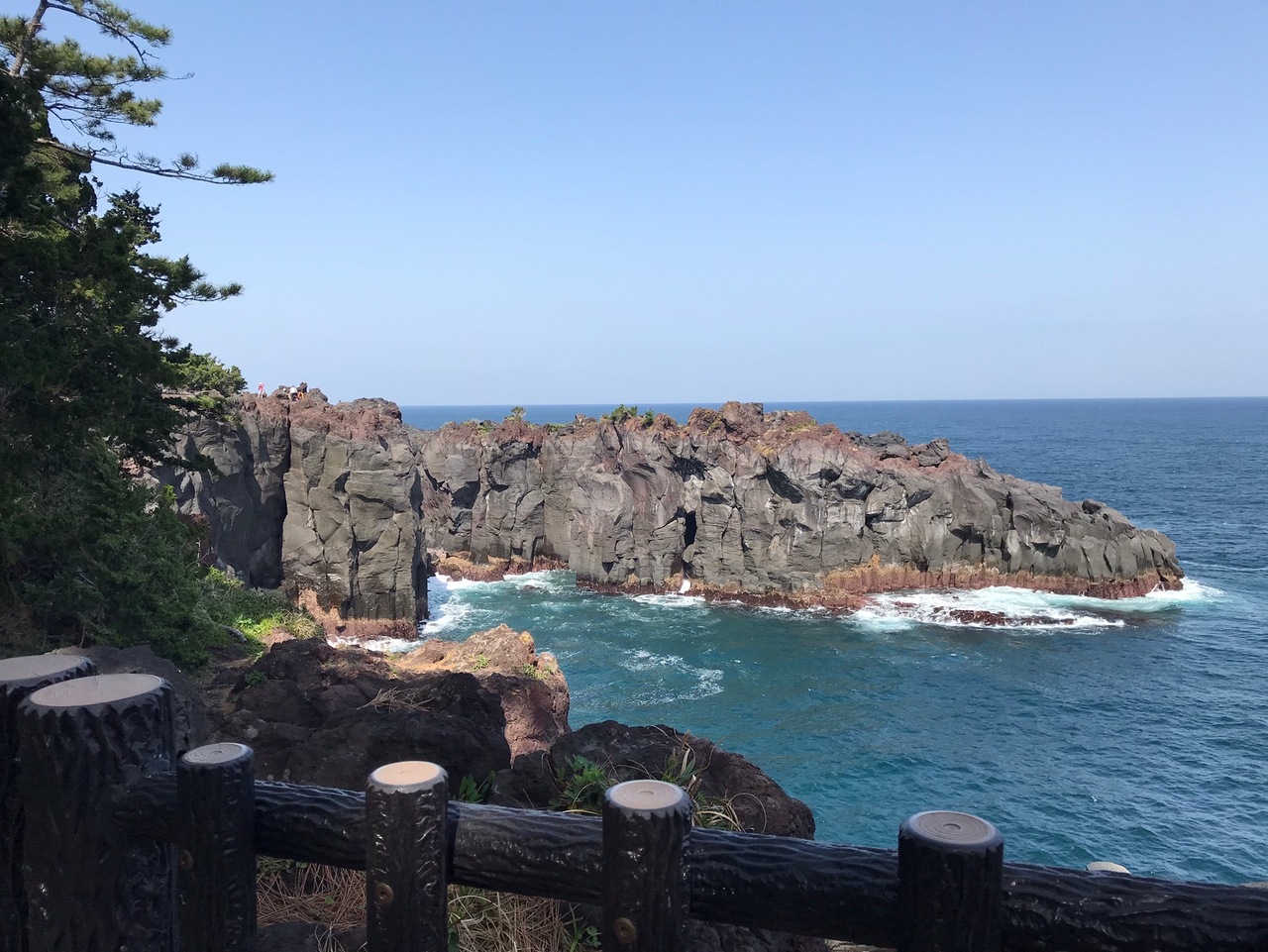 大室山が約4000年前に噴火した時に溶岩が流れ込んで出来たのが城ヶ崎海岸だそうです。ピクニカルコースは全長9キロメートル程あり、遊歩道になっていて、この城ヶ崎海岸を眺めながら散策することが出来ます。特徴的なゴツゴツした黒い岩肌の景色は見応えがあり、門脇の吊り橋や灯台などのスポットも魅力的でした。